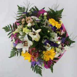 26,00€Ram rodó amb diferents flors naturals Lilium, margarides, clavell mini, etc. Embolicat amb cel.lofana i llaç de ràfia Targeta personalitzada gratis